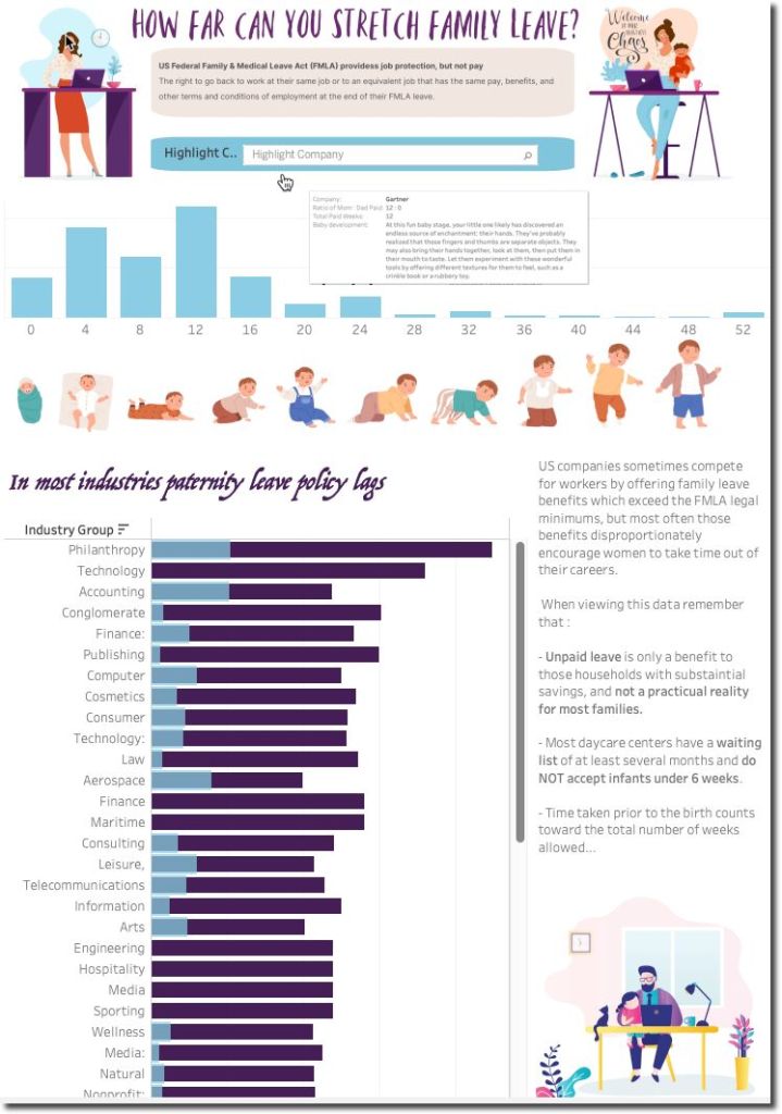 I made this infographic in Tableau with the Maven Analytics playground data – modified to reflect FMLA laws and child development typical phase by week from Parents.com.