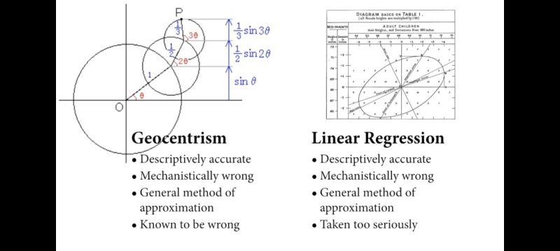 In Statistical Rethinking, McElreath (image credit) shows how the geocentric model of the solar system and linear regression applied in analytics can be similarly predictive without being accurately explanatory of the underlying phenomenon they are being used on.