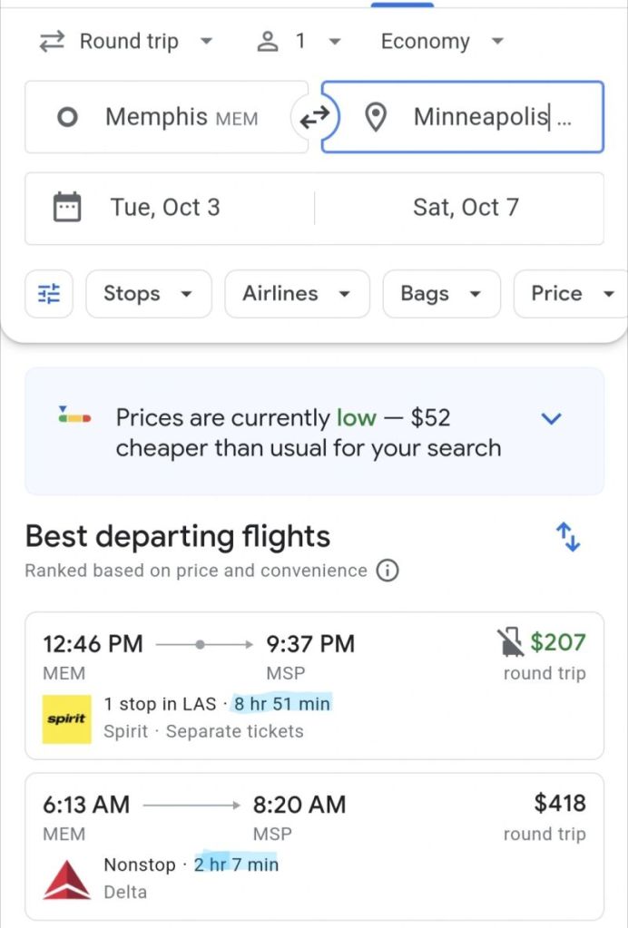 In the sample Memphis to SFO itinerary the company can save $211 by forcing the employee to waste 6 hours and 45 minutes of their life and risk that their baggage is lost on the transfer or that they get stranded in the intermediate city.