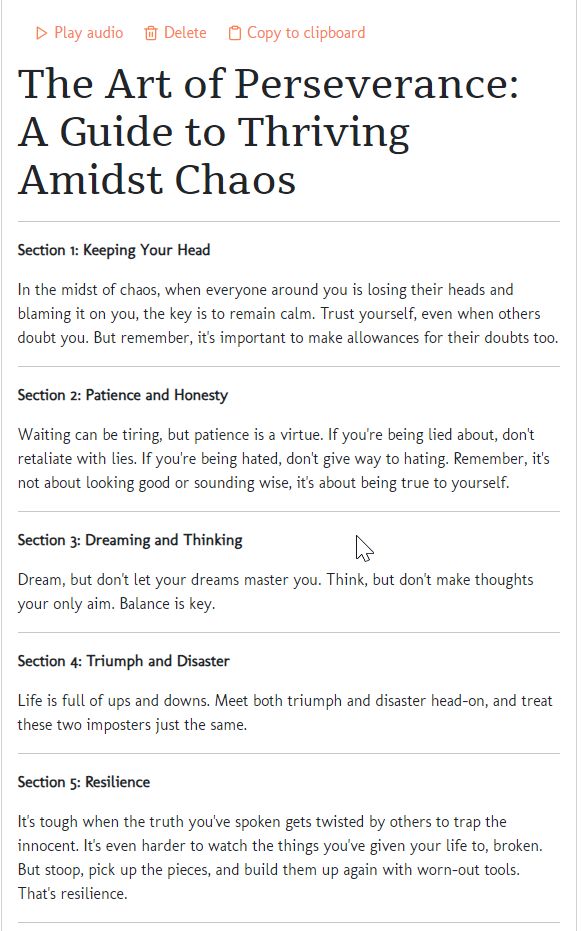 3)Get your first draft: I selected a medium length draft to transition the audio into a written document. It breaks the poem into 9 sections with Bold Headers which label the key theme of each section.
