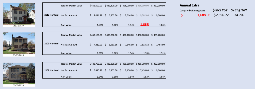 I’m paying ~$1700 more annually than the two neighboring properties which are almost identical, also 2400 sq ft up/down duplexes with detached 2 car garages.