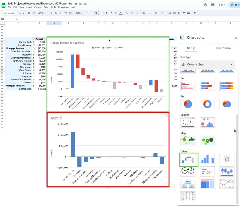 The image is an example from my rental properties which provides the functionality of a pie chart — showing the relative contribution of multiple categories to a whole, but also enable the visualization of negative and positive values together.