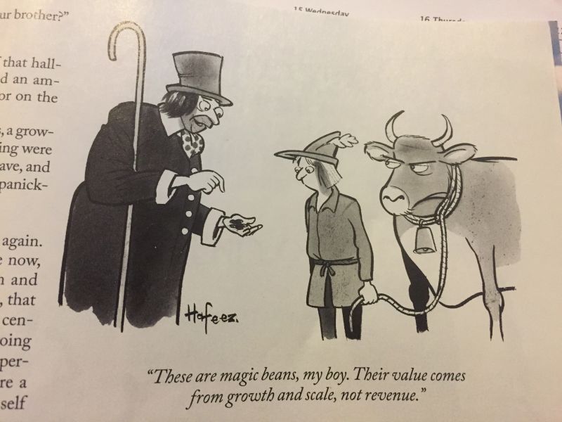 This is a photo I took of a cartoon in the New Yorker in 2015, but the disassociation of corporate valuation from economic fundamentals is even nuttier these days.